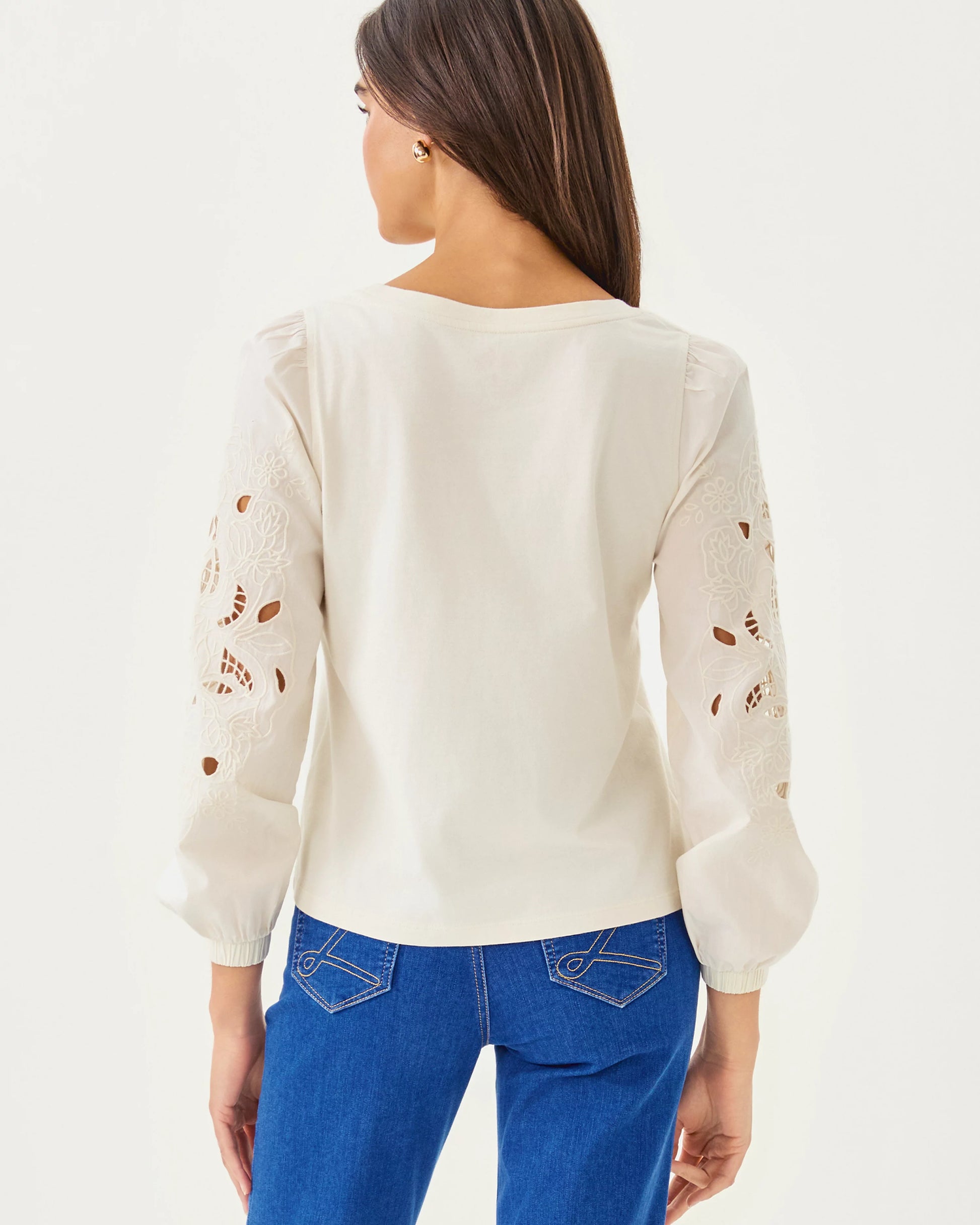 - Straight fit top with a scooped neckline and custom eyelet embroidery on the long blouson sleeves.